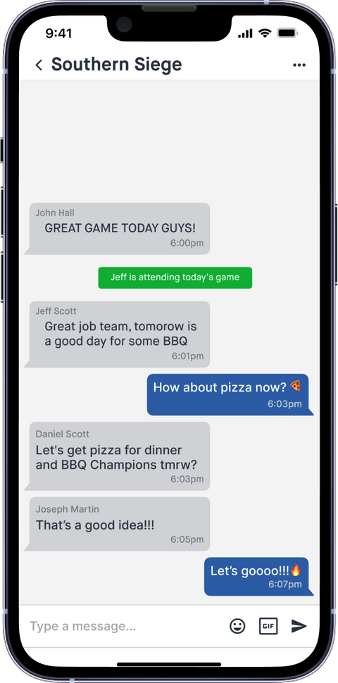 Team Chat offers an immediate, direct communication channel for all players and team reps of each team. The Announcements feature ensures everyone following your team stays updated instantly.